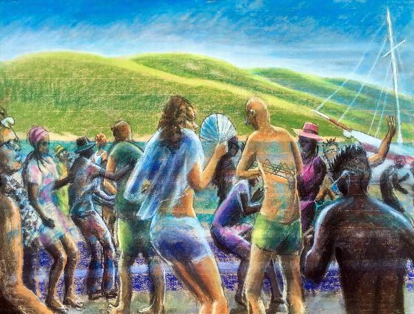 Drawn/painted in artists pastels straight after Southport Weekender 2022, at Butlins, Bognor Regis, when the Sounds and Images were still fresh. Pastel and charcoal on blue Canson Paper 75cm x 55cm. From ‘Secrets Of Southport’, - a series of 8 new artworks exploring  and celebrating the Happenings of Southport 2022, - which have not been published or exhibited until now (March 2023). A Ltd number of Pre-order, individual prints are available before this year’s event kicks off on March 17th