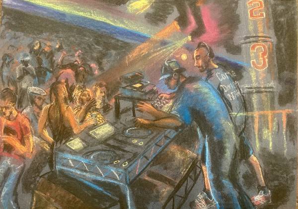 Drawn/painted in artists pastels straight after Southport Weekender 2022, at Butlins, Bognor Regis, when the Sounds and Images were still fresh. Pastel and charcoal on blue Canson Paper 75cm x 55cm. From ‘Secrets Of Southport’, - a series of 8 new artworks exploring  and celebrating the Happenings of Southport 2022, - which have not been published or exhibited until now (March 2023). A Ltd number of Pre-order, individual prints are available before this year’s event kicks off on March 17th