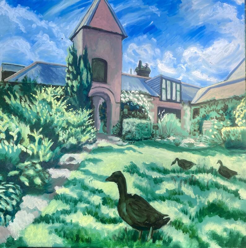 The rest of the afternoon and evening was spent mixing and applying hues akin to the dark green shadows and bright yellow sun-streaked patches on the grass-ground and showing the way the slanting sun hit the different materials of the buildings., - brick, slate and pebbledash. Defining the trees and plants I try to show not just colour, light and dark, but also shape, and the way the individual plants and trees grow. Short or long? Sharp or soft? Upwards or downwards? bright or dull?