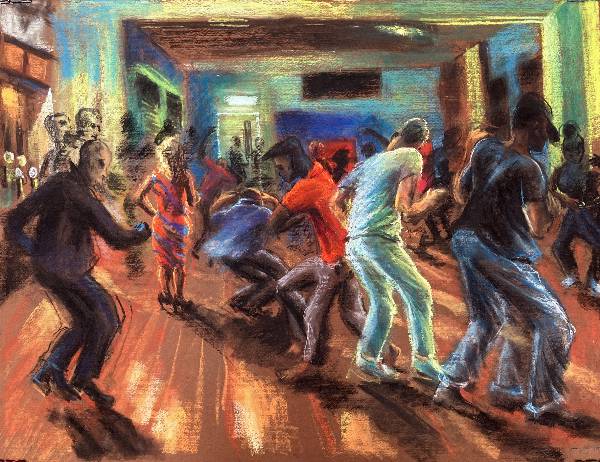 Drawn live on location at 'Makin' Moves' House-dance Club at Trapeze, Gt Eastern St, London Dec. 2014. Commissioned by Matt Langrish Smith. Charcoal and dry-pigment pastel on Canson Paper 75cm x 55cm