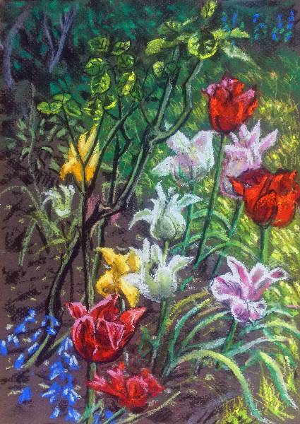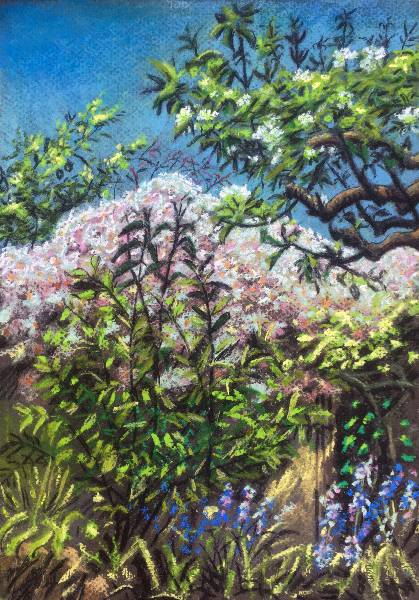 As the orbit of my world and travels shrinks in Lockdown 2020, so too do my artworks, -from macro to micro: - Small drawings and paintings exploring intimate and colourful garden corners, whilst celebrating an exceptionallyt sunny Spring
