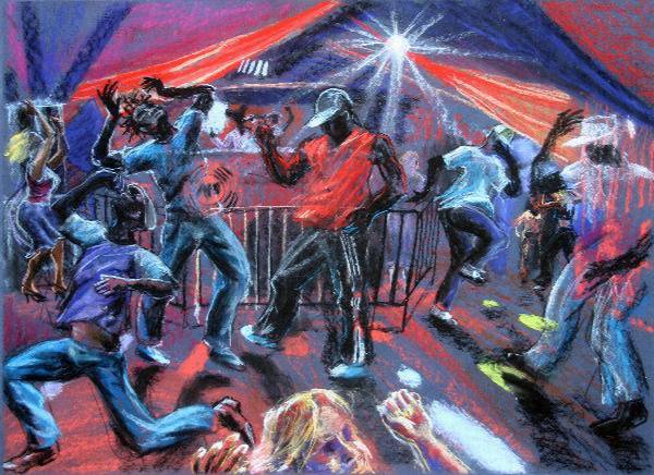 Made in the studio in 2007, with ref. to earlier 'live' charcoal drawings made on site in the Bacardi B-Bar at Southport Weekender. The original 'Redman' is in the collection of Sacha Bernardis.I made a copy using identical materials, which is still in my possession. The Giclee prints are made from the original 1st version. Pastel on Canson paper. 75cm x 55cm. 2007