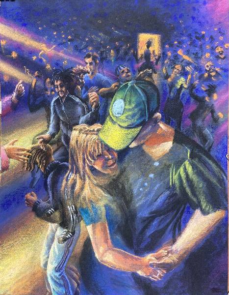 I have been dancing, - and drawing The Dance - live at Southport Weekender since I first visited at it’s original location at Pontins, Southport in year 2000, through the Minehead Butlins years, to it’s current location at Butlins, Bognor Regis (via it’s satelite festival Suncebeat in Croatia). That’s 23 years of drawing/painting live on location in real time. What began as a bunch of ‘live art’ experimental drawings has been transformed by the project’s longevity into a robust visual archive evoking the spirit of the musical-dancikal event whilst also marking and celebrating it’s persistence and development.
