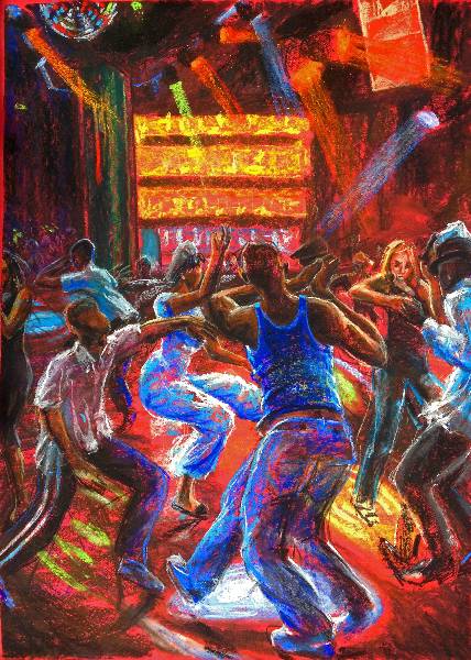 I call these images 'unstill lives'. Drawing people in movement, on a musical wave-length. They are the opposite of 'still life' painting, - (the painting of silent and 'still' bowls of fruit and flowers)... Compositions of dancers and venues made ‘live’ on location in jazz, soul and funk clubs in London, Uk and Beyond. 1990-2020. Fuelled by participation and observation. The images catch or court the spirit and atmosphere of the music and dance of each specific event.