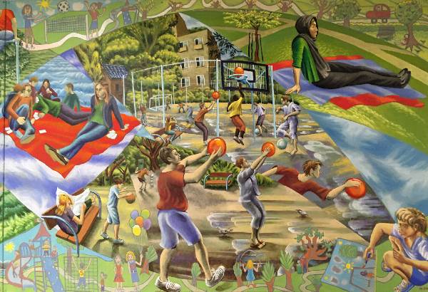Painted panel from 'The Passage' mural cycle. Acrylic on rendered plaster wall, Kings College Hospital main corridor. (Approx. 7ft x 9ft). 1995.