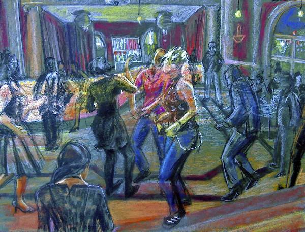 Pastel On Canson paper. 75cm x 55cm. 2005. Drawn 'live' on location at 'New Century Soul' Rare Northern Soul All-Nighter Queen's Hall, Stoke On Trent. Reworked and finished in the studio.