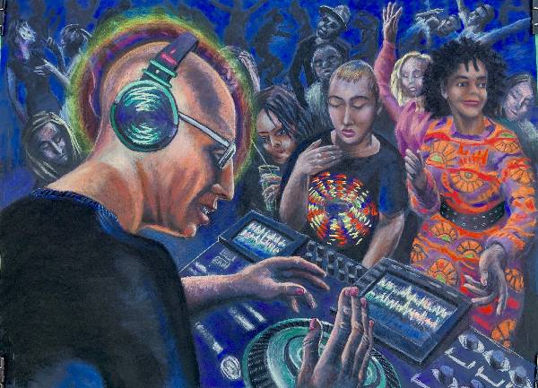 I have been dancing, - and drawing The Dance - live at Southport Weekender since I first visited at it’s original location at Pontins, Southport in year 2000, through the Minehead Butlins years, to it’s current location at Butlins, Bognor Regis (via it’s satelite festival Suncebeat in Croatia). That’s 23 years of drawing/painting live on location in real time. What began as a bunch of ‘live art’ experimental drawings has been transformed by the project’s longevity into a robust visual archive evoking the spirit of the musical-dancikal event whilst also marking and celebrating it’s persistence and development.